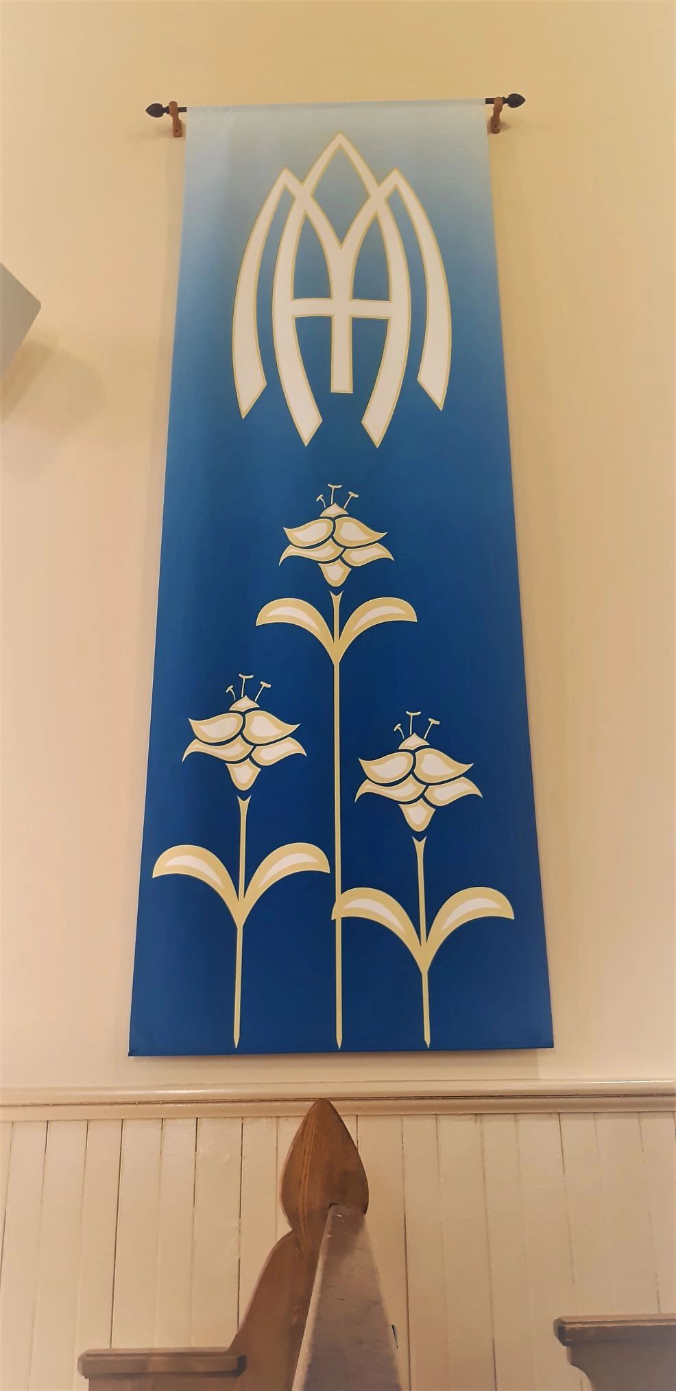 We are hopeful that we might be able to gather for worship in the near future, and enjoy the beauty of this banner in person.